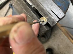 Like most Velo owners I have had my struggles trying to stop the clutch springs from bending whilst tighting up the sleeve gear nut. I have tried pulling out the spring holder to try and support the springs, lightly ground the ends and radiused the edges even polished and greased them to no avail. I recall some years ago, printed in F/T members suggesting using the centre tube of ball point pens cut to length and inserted into the spring and another fitting brake rivets on the head of the spring. So when I had to assemble my Venom (with new plates) I thought I’d try the F/T ideas. Not being keen on the pen idea I went to my rivet box to find some brake rivets, on fitting them I found they were loose and rather heavy, plus I wanted to keep them in case I needed them in future. However in the box sat a cheap eyelet kit as sold in D I Y shops and I found that, with a bit of a push the eyelets fitted perfectly . Some were even made of brass, so I made a tool out of a bit of round brass and drilled it slightly larger than the spring diameter and to a depth of 1/2″, placed them in the vice, tightened, and they fitted firmly without falling out. With a bit of grease on the end and the spring holder pulled out towards the nut it worked a treat, simple yet effective and I wondered why I had not thought of it years ago.